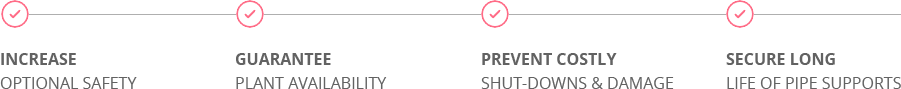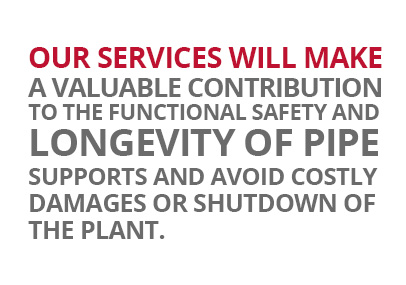 Our engineers will supervise installation of piping systems into the supports prepared, inspect the system for correct installation according to drawings, deblock and commission the supports, conduct load and travel checks after commissioning, and inspect for freedom of movement of the pipe system in all three planes.